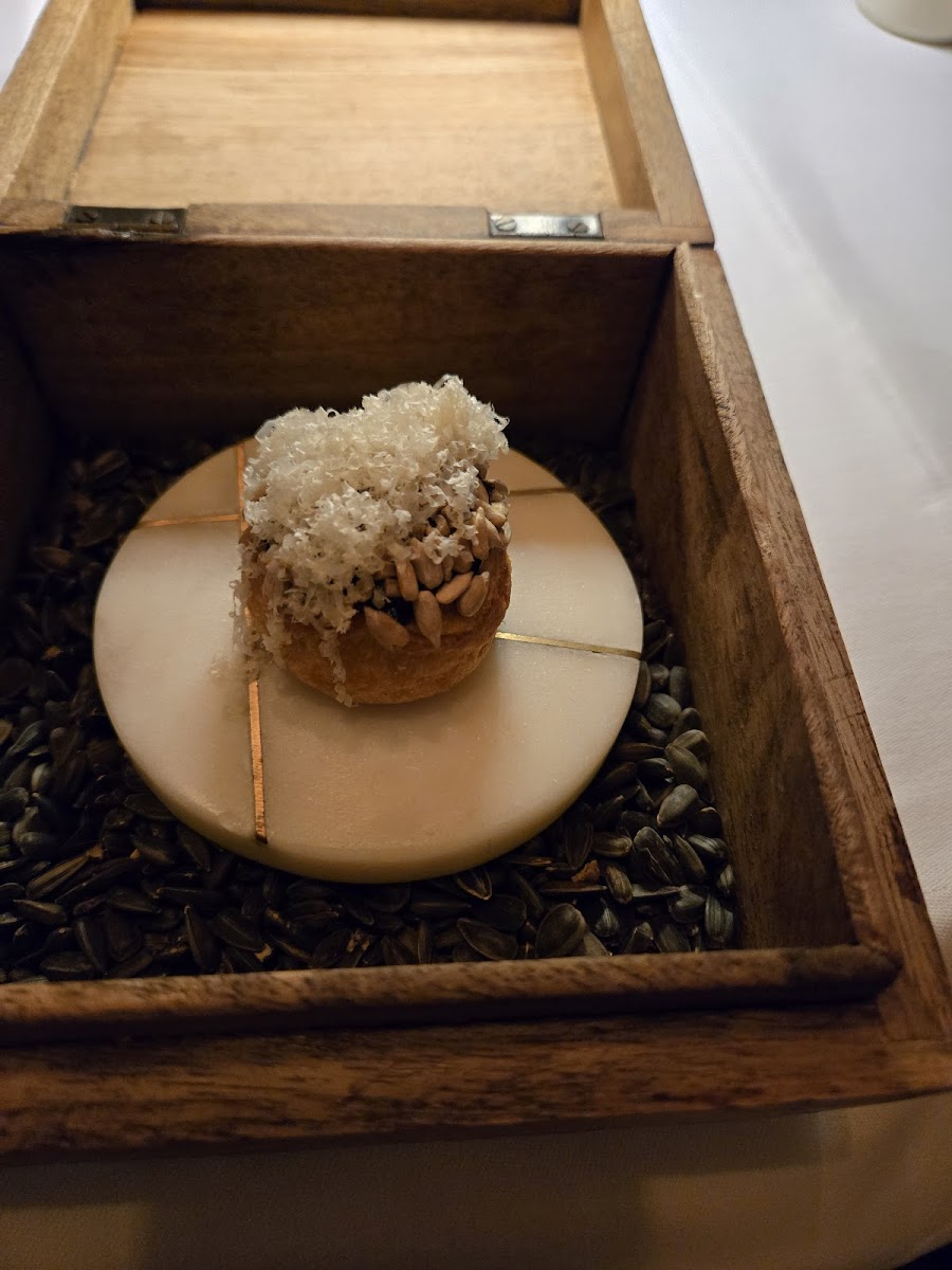 An outstanding tasting menu, with exceptionally well selected wines in both price levels of wine flights. These guys deserve their Michelin Star for the food and impeccable service. Each course presented beautifully and carefully described. The more expensive wine flight was amazing, such quality but not necessarily from “obvious” locations. Located in an old town house, the atmosphere seems quite intimate, no need for harsh Muzak in the background, lots of care and attention to detail.